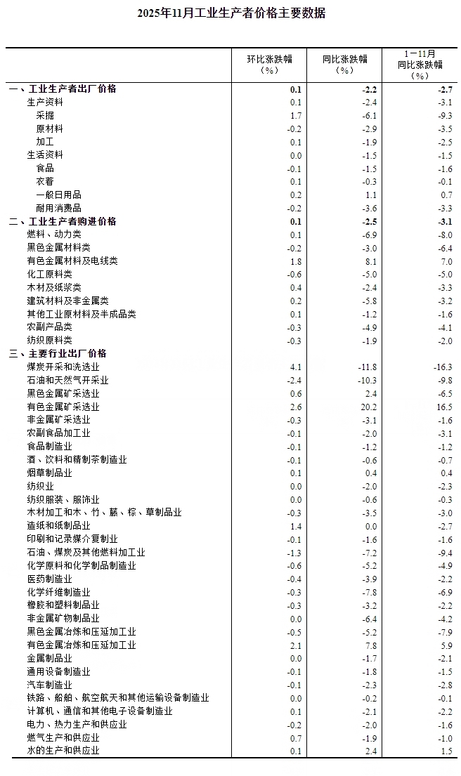 2025年11月份,全国工业出产者出厂价钱同比下降2。2%,工业出产者购进价钱同比下降2。5%;工业出产者出厂价钱和购进价钱环比均上涨0。1%,涨幅均取上月不异。1—11月平均,工业出产者出厂价钱比上年同期下降2。7%,工业出产者购进价钱下降3。1%。